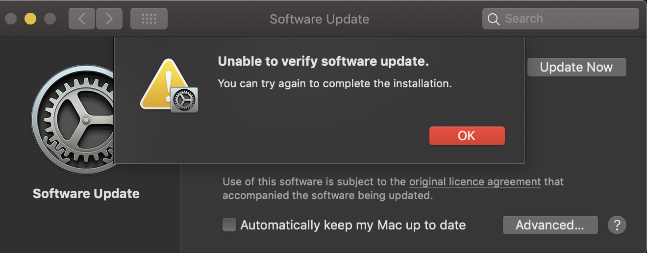 I just finished downloading the new Mac OS update 10.14.6 but when I click on 'Update Now' it says "Unable to verify software update." What seems to be the problem? I checked my internet connection and it's working fine. I also restarted my Macbook Pro 2018 but it's still showing the same message.