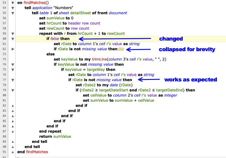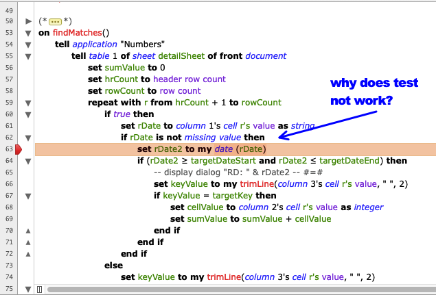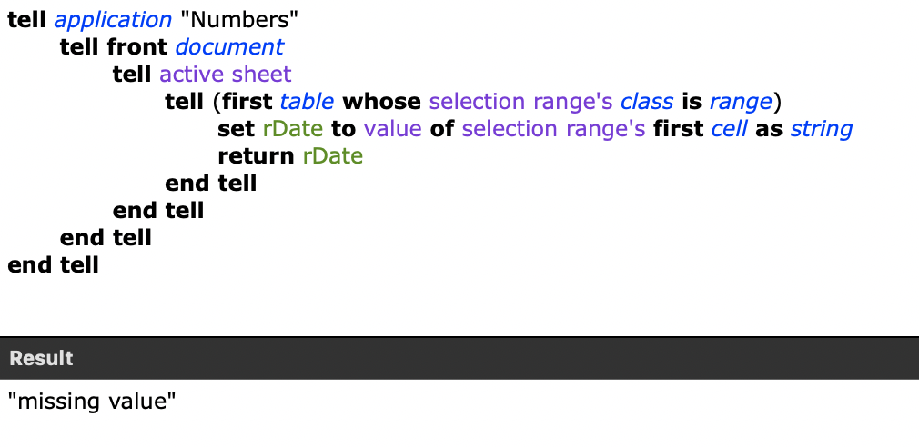 - For some, as yet unknown reason, despite the result being "missing value", the script dies on line 63 rather than skipping the block due to the test on line 62. Why?