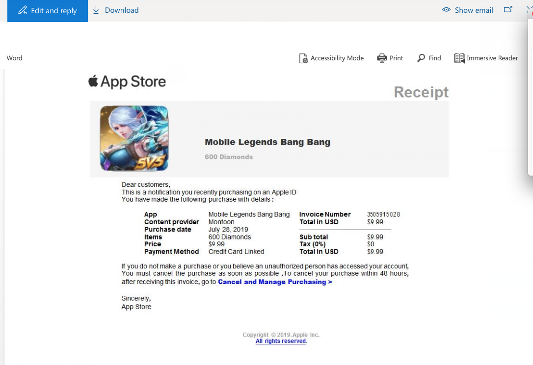 See Pics. Don't fall for it. If you click on it; it redirects you to fake apple site to type your credentials.