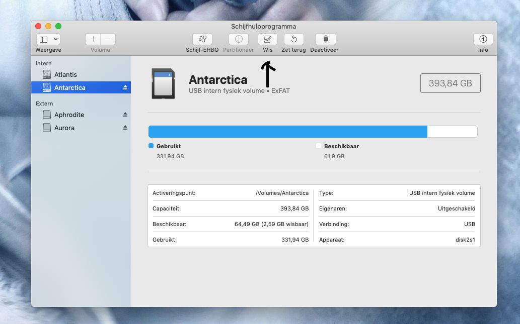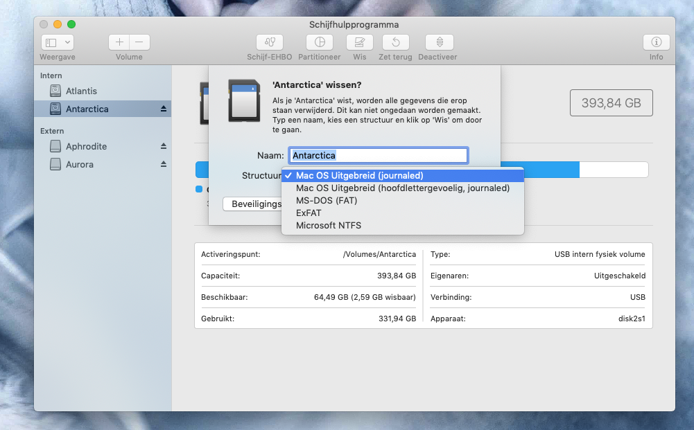 After clicking on the Erase button. You'll get a little menu. Here you can give the card a new name (named mine Antarctica). And from a drop down menu you can choose in which format you wish to format it. I went with ExFat since that one can also be read and written to in Windows and Linux. Next to MacOS.