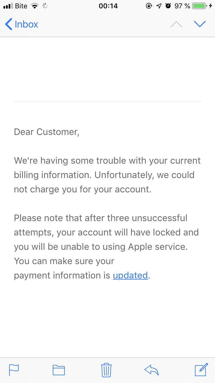 Hello, I’m getting weird emails from weird mail that saying that my apple account payments is not working and that they might cancel my Apple ID.