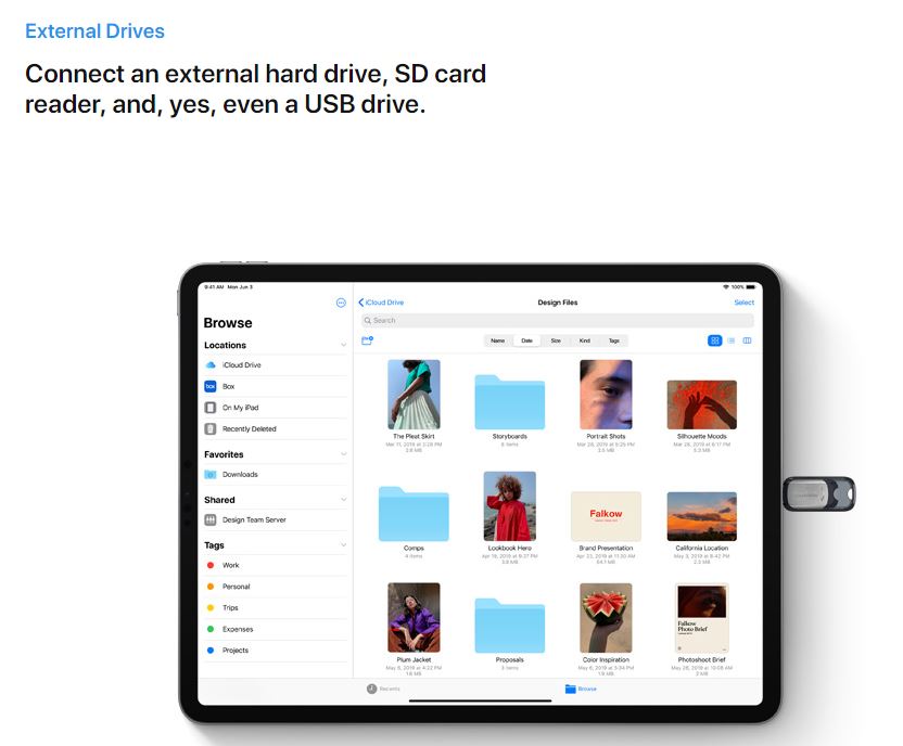 The newest iPads have a USB-C port and with the new iPadOS 13 to be released in the coming months they will support USB drives.