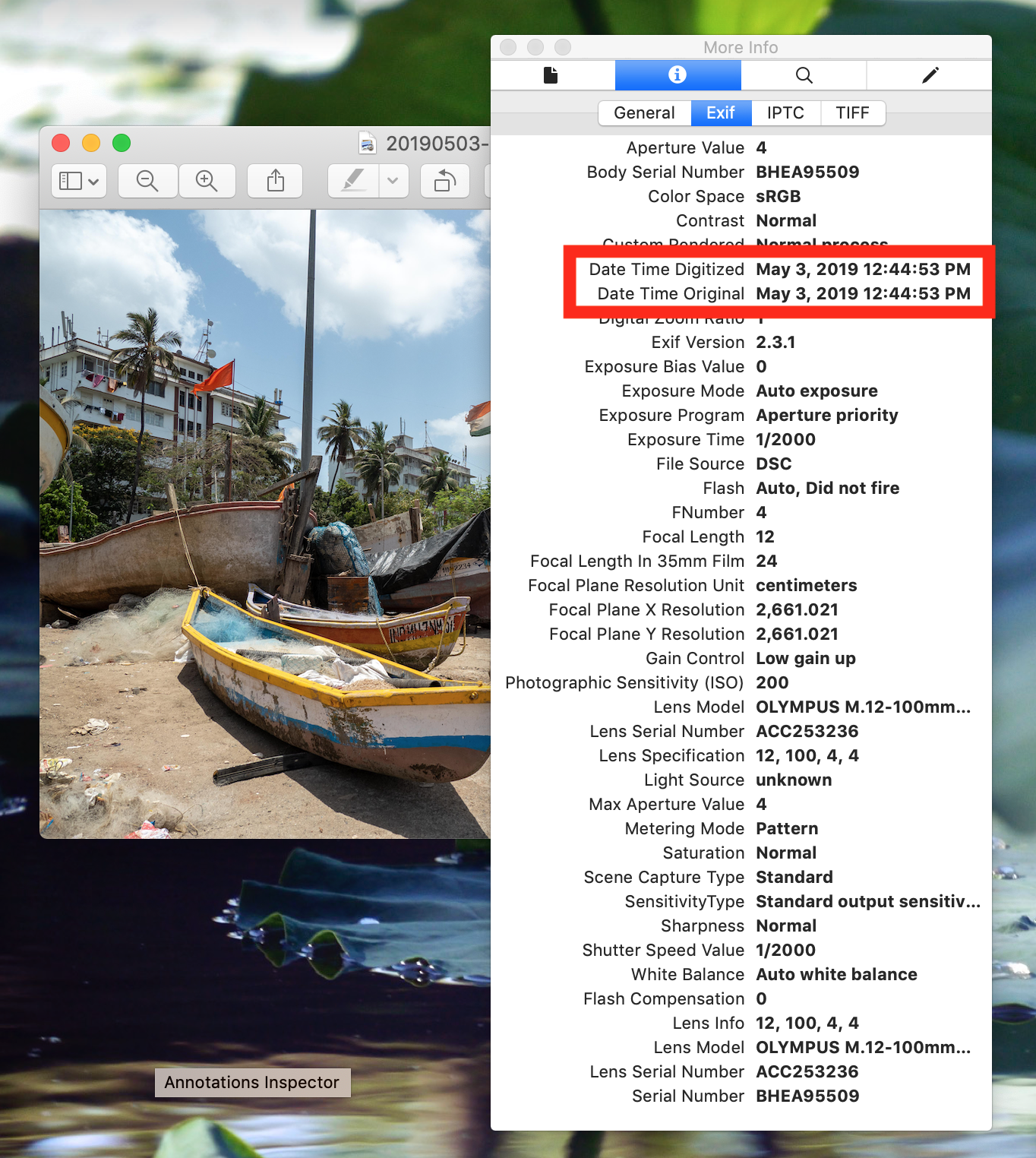 2: The exported JPEG file also has the EXIF info, with the correct capture date. (May 3)