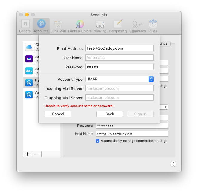 Running a Macbook Pro with OS 10.11.6 and Mac Mail 9.3. Have had a Vistprint IMAP email account running fine on this forever. Suddenly in Early August it stopped sending emails from this account (didn't recognize password or user name). Neither was changed. Was still receiving email fine. Same account running fine on both iphone and iPad. Tried deleting the account completley and now when trying to "add a new account" it will not recognize the user name (email address) and password, which I know work on iphone and iPad. Almost like something in the Mac is preventing or blocking communication with Vistaprint server. Any advice?