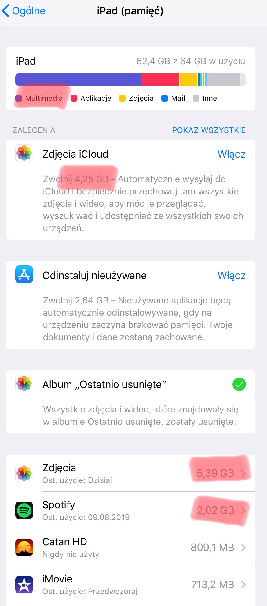 I am running out of free space on a 64GB iPad. Settings shows that media consumes about 60% of the disk (~38GB) while it also shows that Photos occupies 5GB and the largest app is Spotify with 2GB usage. I don’t use any other app with offline media content. I does not sum to 38GB in any way!