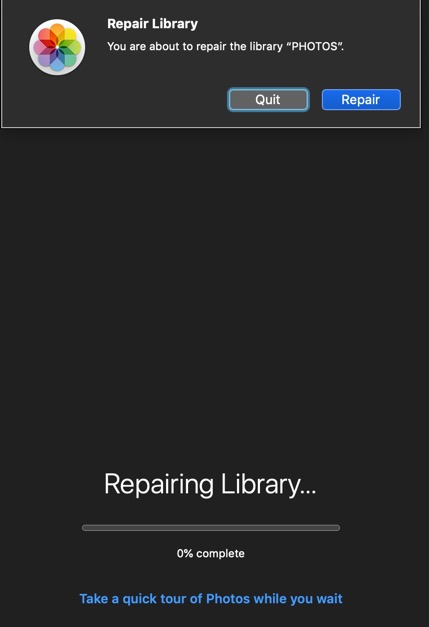 Open your primary library and then close Photos. Hold down the Option key and launch Photos. When you library comes up let the repair procedure go thru.