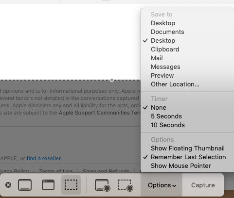 The shift command 5 interface lets you choose options for destination of screenshots—no terminal code is required.