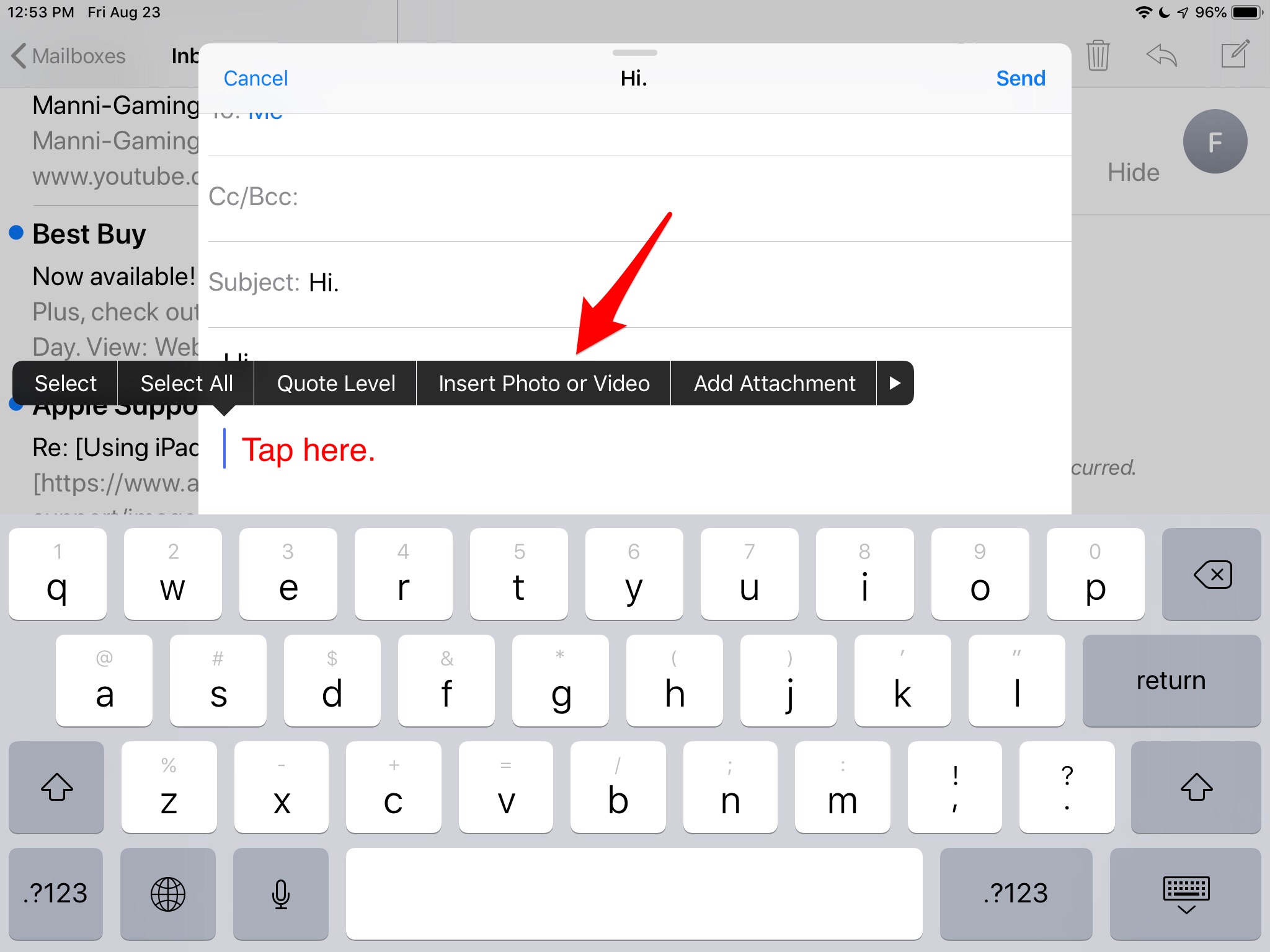 Additionally if you have already started the email, tap after the insertion point, tap insert photo.