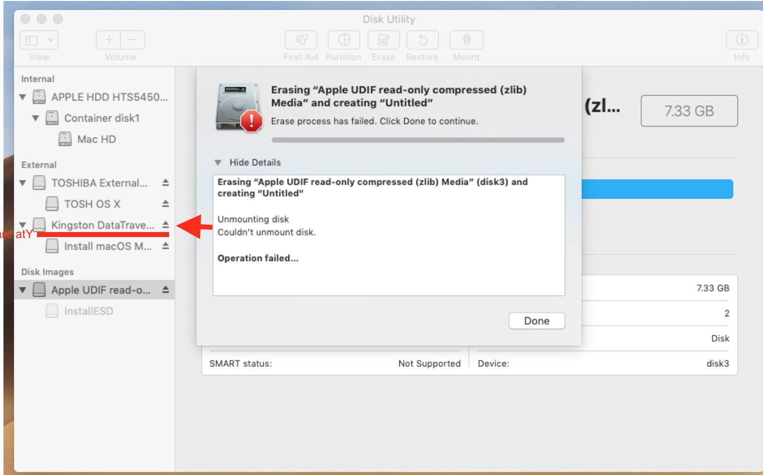 I now want to erase the memory stick but Disk Utility fails every time, reporting that it either cannot open or unmount the drive.