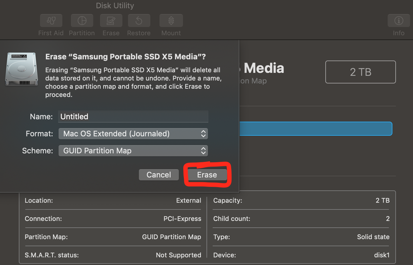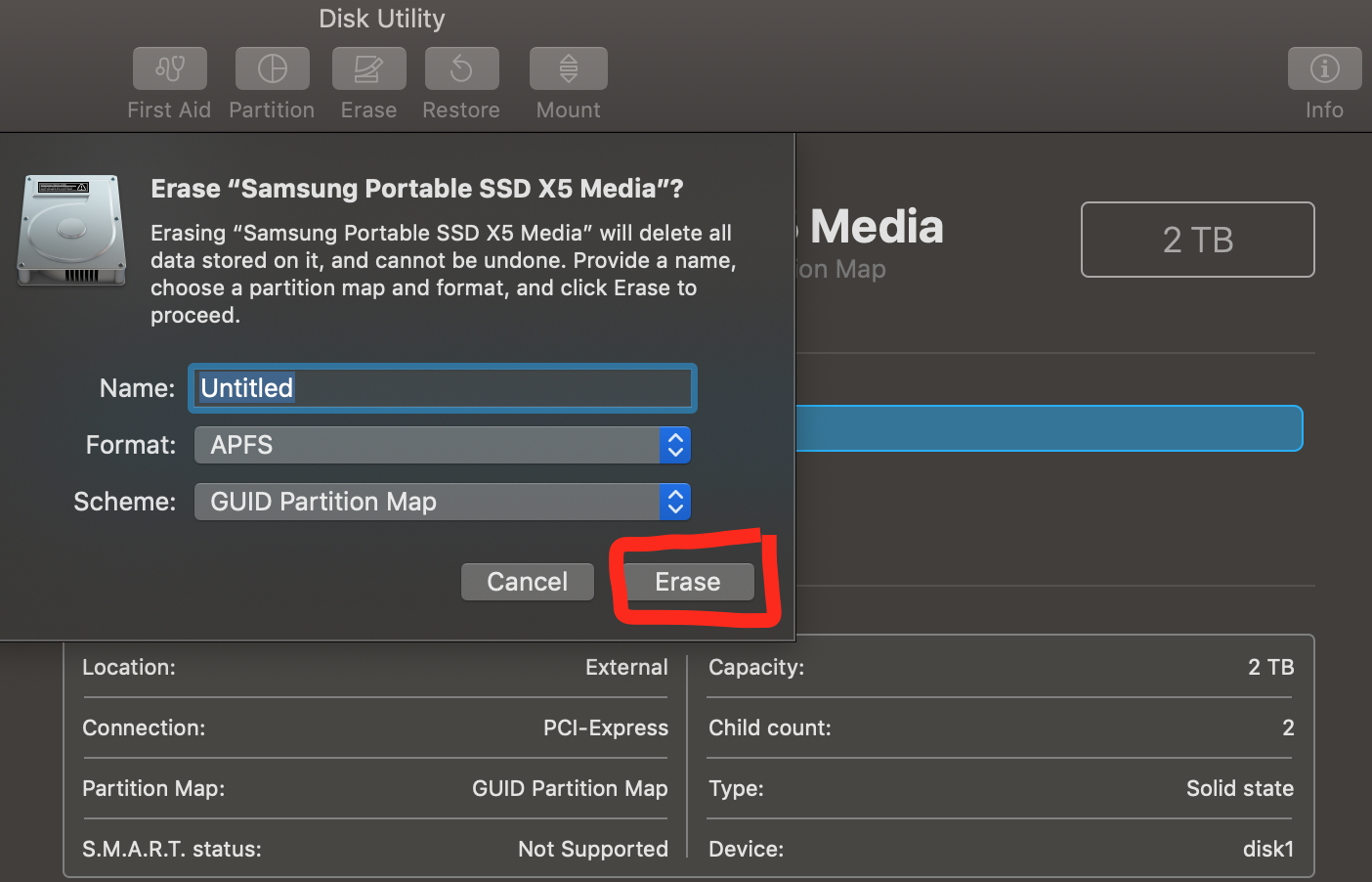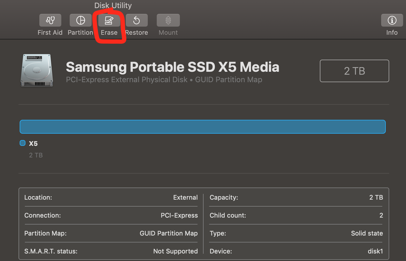 I can erase the X5 with DiskUtility, but the 'Partition' button is disabled and 'Erase' does not show the combo to select the GUID partition table,, and the resulting disk in not bootable. There is also no choice for APFS.