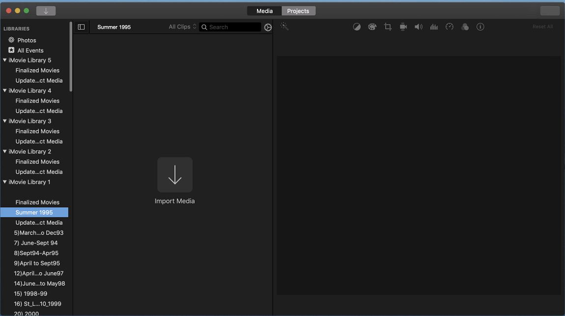He bought a Mac in Dec. 2016 and spent a good couple of years importing piles of video, editing them, creating videos, etc., etc., there's pages of projects in the list. Then he upgraded to Mac OS Mojave 10.14 and upgraded iMovie from 8.0.6 to 10.1.12.