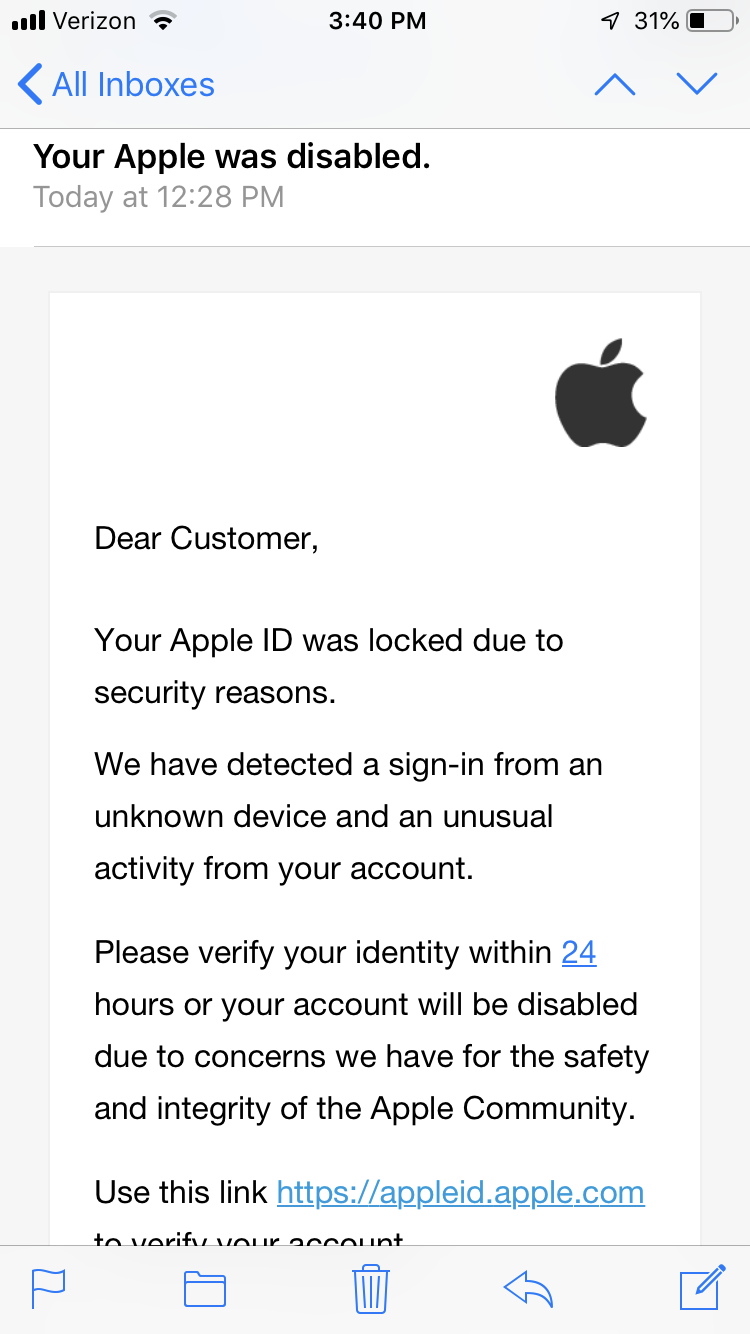 The e-mail will be from @apple.com or @iTunes.com. E-mail addresses can be spoofed. You can go to Mail/View/Message/Show all Headers to see more. Apple e-mails will never contain an attachment. Apple will never request personal information by email such as Social Security numbers, your Mother’s maiden name or full credit card numbers .