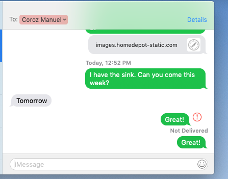 I am running Mojave 10.14.6 on my MacBook Air. I can send and receive iMessages fine. I can also receive SMS messages but I am unable to send them.I get the red exclamation mark and the Not Delivered status. If I send an SMS from my iPhone, it shows up in the thread on my Mac. In the attached screen shots, the "Not delivered" messages were ones sent from the Mac; the successful ones were sent from my iPhone and showed up on the Mac. I have closed and reopened the Messages app; I have rebooted the Mac. I am not sure of the significance of the pink/orange status for the recipient.