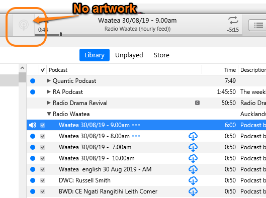 That's not all. When I downloaded an episode (and no, I cannot speak Moari), I thought it was taking a long time to do so. If you look in the screenshot below, the episode highlighted in blue is six minutes long. However, until I downloaded it, it stated that it was only 50 seconds in length, as do all the other episodes. And no artwork either.