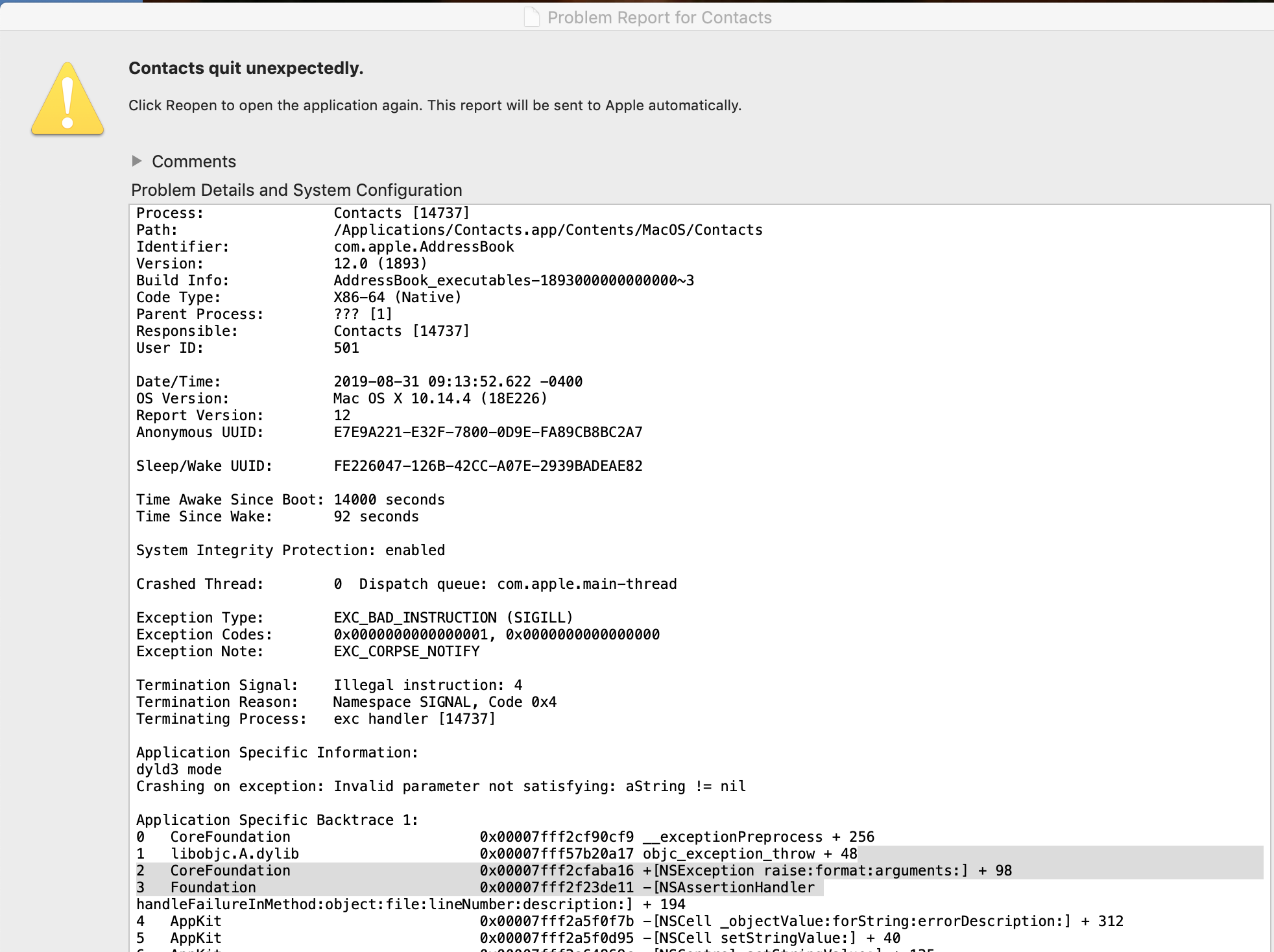 Contacts crashes immediately upon opening. Have started in safe mode and still occurs. Does not occur with other users on same Mac. Occurs even if wifi not connected. Have run Apple startup diagnostic and all is good.