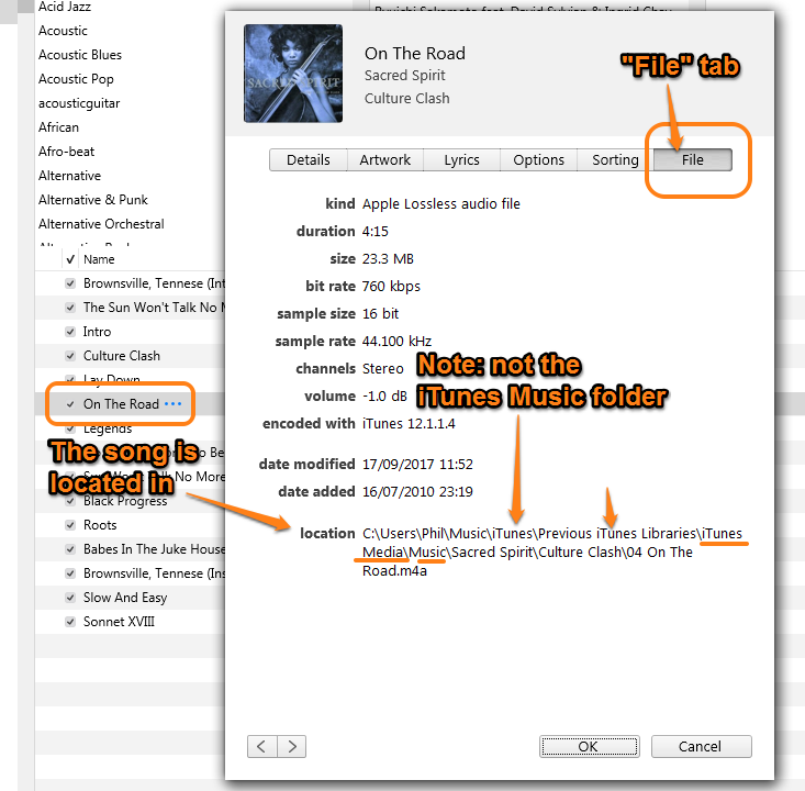Look carefully at the location for the song in the screenshot. This song is not in the iTunes Music folder, it's in a sub-folder of iTunes/Previous iTunes Libraries and in that folder is yet another, named iTunes Media and a further one named Music. Now we can see the artist (Sacred Spirit) and the file for the song On The Road.