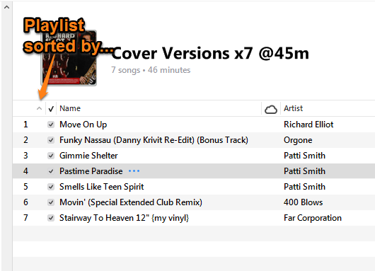 Click on the column header to cause iTunes to sort by that column, which puts the playlist into manual sort mode. If the arrow is pointing downwards, click the column header again to cause the arrow to point up instead. Here you can: