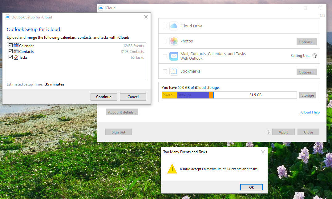 Message appears with "Too Many Events and Tasks: iCloud accepts a maximum of 14 events and tasks". Have checked iCloud sync parameters and way below.