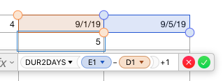 =DUR2DAYS(E1−D1)+1