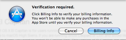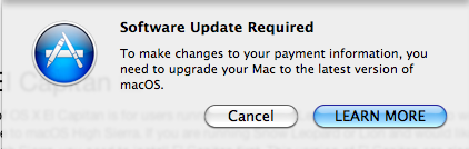 I have a catch 22 situation. I want to upgrade from Snow Leopard (OS 10.6.8) to El Capitan (OS 10.10) on my 5.2 white Macbook. On the Mac store I can see El Capitan (see attached screenshot), but when I try to download it I get a 'Verification required' notice asking me to update my billing info. When I click the Billing Info button, I get "Software Update Required' which is exactly what I am trying to do. So basically I can't upgrade my OS to Yosemite without upgrading my OS. Grrr!
