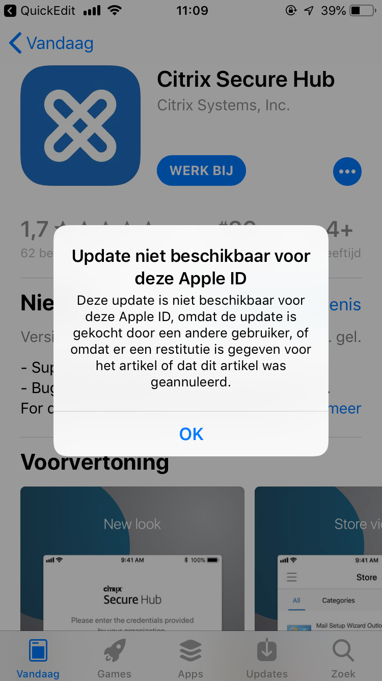Ik probeer een aantal apps bij te werken, maar krijg de volgende meldig. (Zie foto)