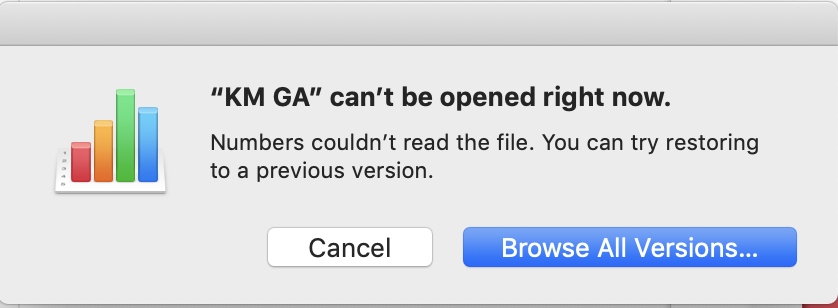 When I try to browse older versions of the file within numbers app and try to restore any older version, I get another error message: "the document could not be reverted. The file format is invalid. This document can no longer be used because its file become unreadable, so it must be closed."