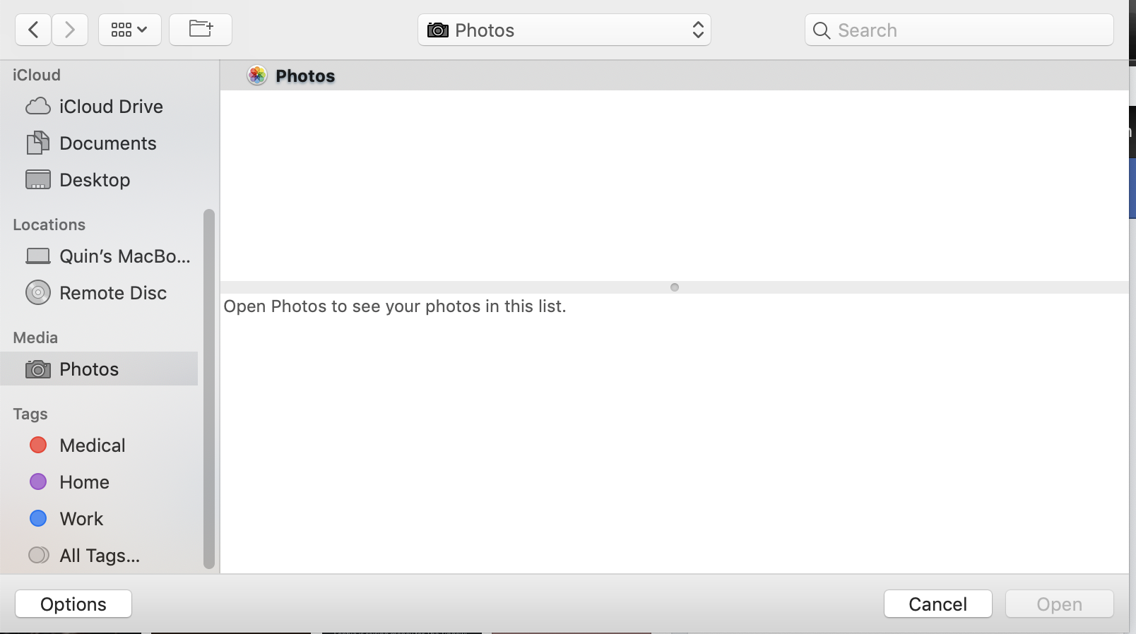 My mac is set up with icloud photos enabled, and the photos library is already set as the system library. Nonetheless, whenever i try to access photos from another app - eg, chrome or safari - i still get the "open photos to see your photos in this list" message (which doesn't do anything)