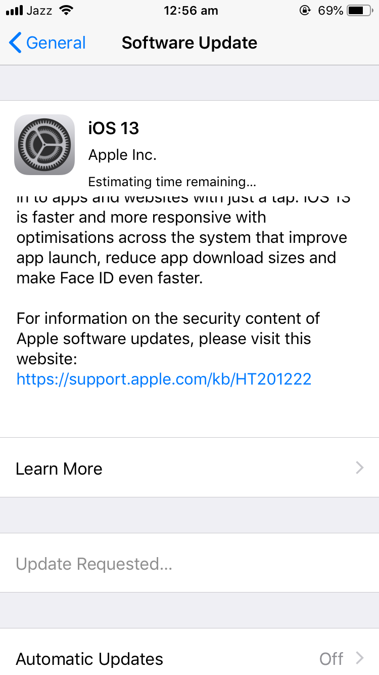 On updating iPhone 6s for iOS 13 it got stuck on updating request