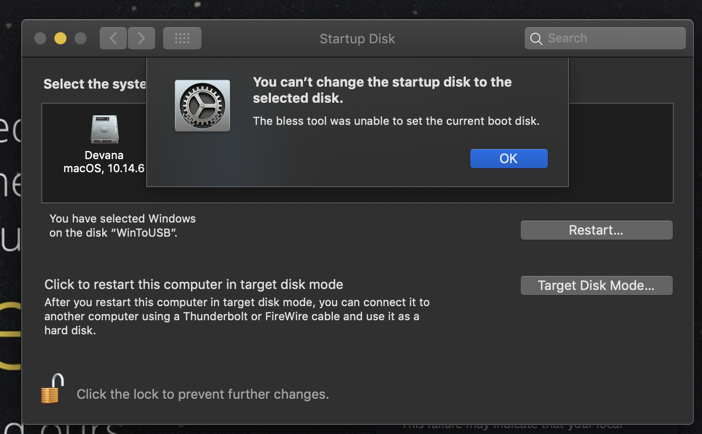 I recently bought a MacBook Pro and decided to keep windows on an external ssd. I was able to install it fine and it all works with one exception - I can not switch disks via Startup Disk as I get this error: