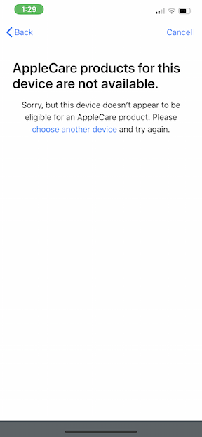 However, on the Settings screen, it keeps prompting me to buy AppleCare+ as the complimentary coverage will expire in 55 days. If I click Continue, it says (NULL) and then the next screen says "AppleCare products for this device are not available.e Sorry, but this device doesn't appear to be eligible for an AppleCare product. Please choose another device and try again."