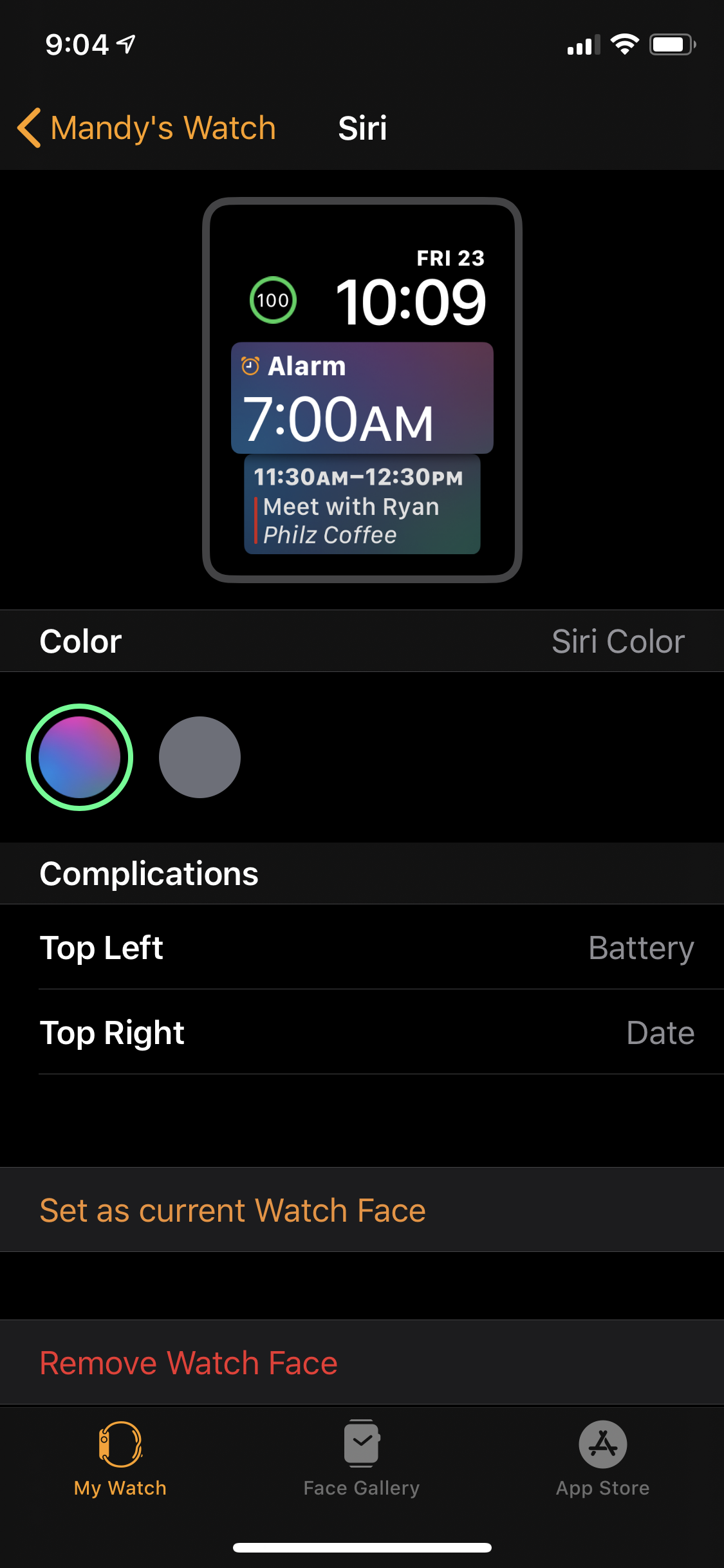 There have been some changes with watchOS 6. With the Siri face, Siri takes a look at your day and displays information that’s timely and helpful. It might be your next appointment, the traffic on your way home, or the score of a game played by your favorite team, and you can tap to get more information. You can also turn the Digital Crown to scroll through your day.