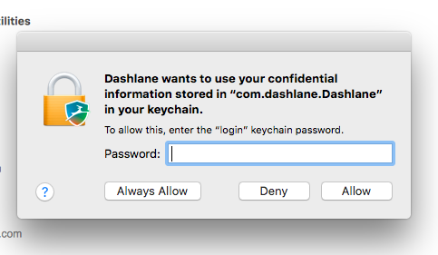I have a VPN available through the Dashlane app. It has worked fine on my Macbook Air for a couple of years. Suddenly, every attempt to access the VPN leads to an Apple dialog box saying that Dashlane requires access to my keychain, and requesting my keychain password. But I have *never* used keychain, and I don't have any keychain password. (I tried using my Apple ID - does not work.) So I close out of the box, and get "Cannot connect to VPN." Any ideas? Thank you!