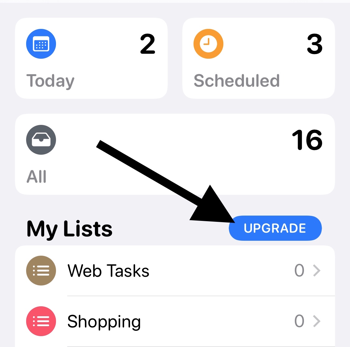 2) Next, in the Reminders app, click the blue UPGRADE button next to "My Lists"