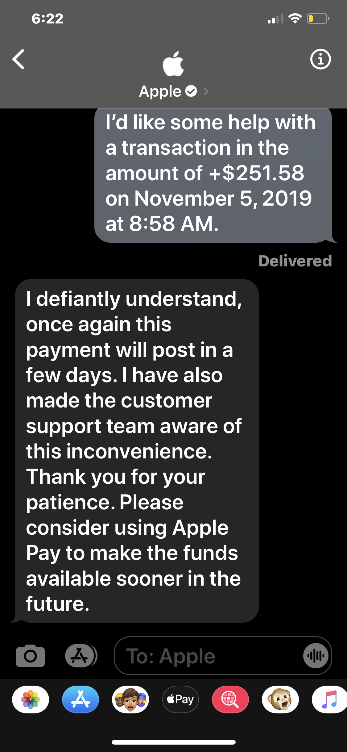 I do not recommend anyone get this card! After being on the phone with reps for over half an hr and being transferred to multiple departments I received an answer that it takes 7-10 days to reflect a payment into your account. The payment was immediately deducted from my account but would take 7-10 days to reflect on my Apple Card balance. Worse credit card and card service I have ever experienced. The only way for a payment to immediately reflect on your available balance is to put money on your Apple Cash then pay off your Apple Card with the funds from your Apple Cash. The most ridiculous thing I have ever experienced with a credit card; I already closed the account after a month, not dealing with that!