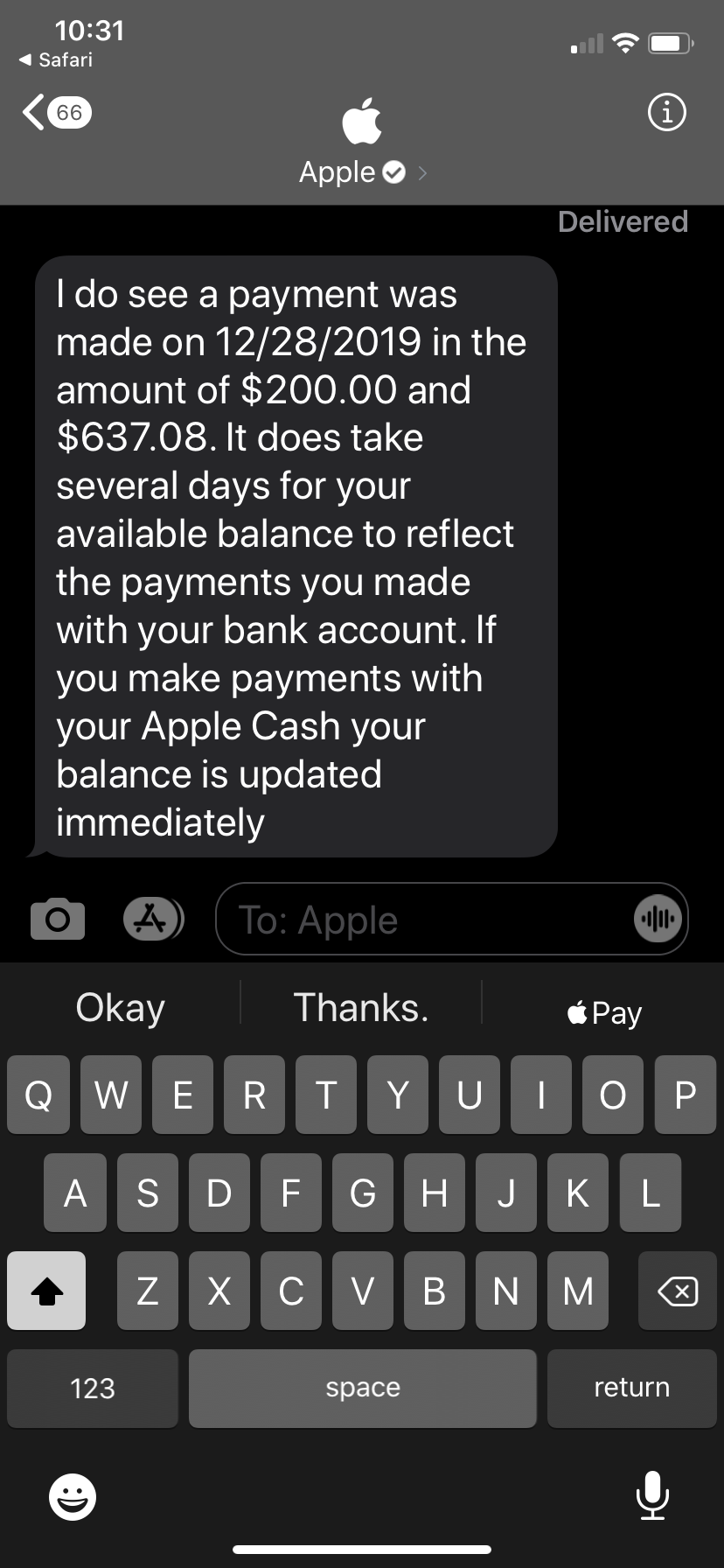 We should be able to pay from our bank and have balances adjusted in a timely manner without routing the payment through Apple Cash.