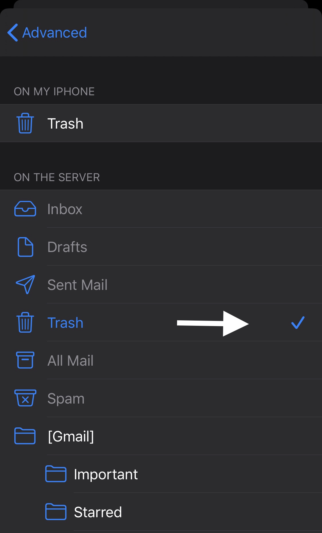 so if your set up does not say ‘trash’ next to “deleted mailbox,” try changing it like I did by clicking the arrow and moving the checkbox to the word ‘trash’ under the on the server area. even in the post for WillApple82...one of his screen shots shows this area has the word ‘trash’ as well. For some reason mine was not defaulted (I possibly did not do something else previously mentioned correctly). screen capture below of the menu after selecting the arrow from “deleted mailbox”