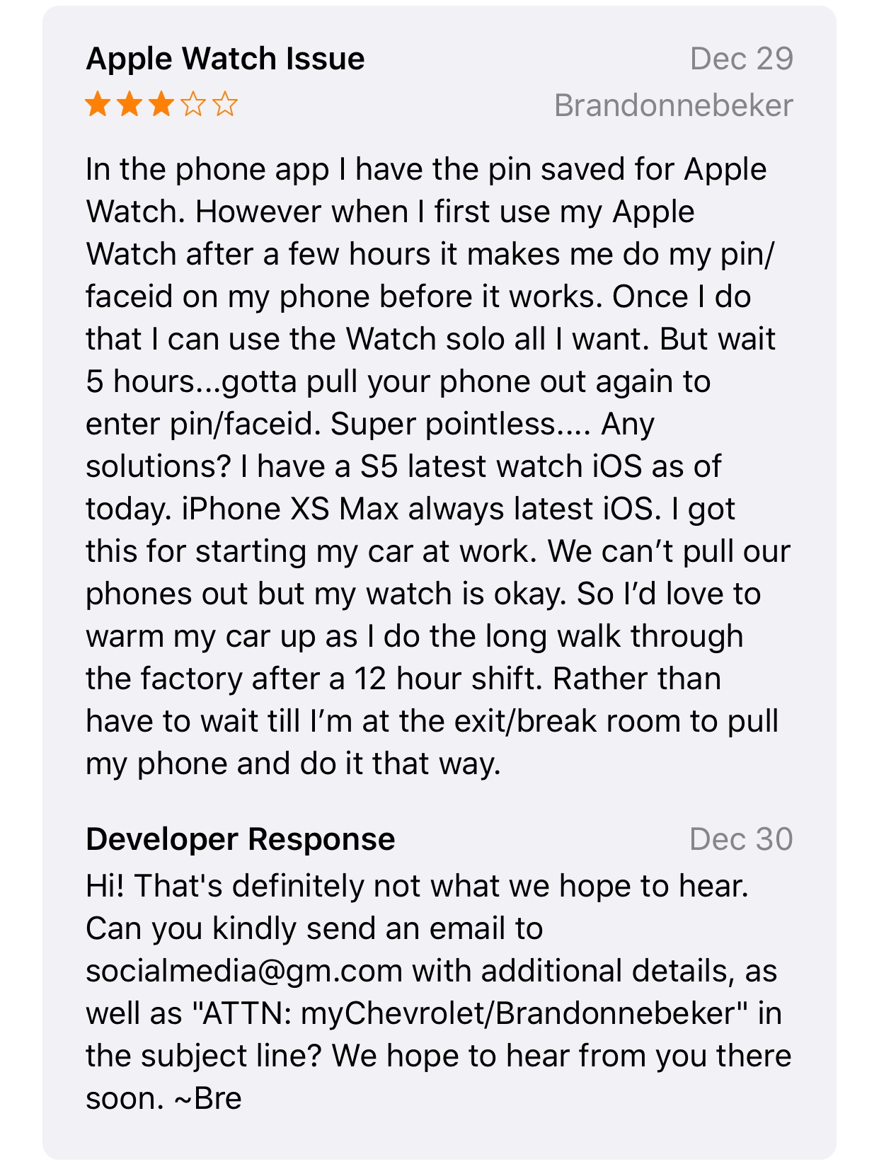 Was loving using the myChevrolet app on my I watch 4 to start my car but after upgrading my phone to the 10s the app on my watch no longer works. The symbol is there but won’t open to the controls. I’ve deleted and reinstalled the app several times with no help. The app does work on my phone. Any ideas would be appreciated.