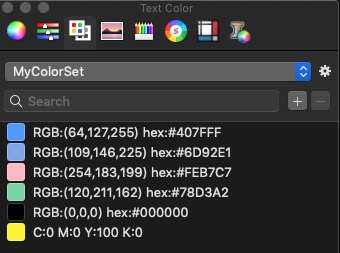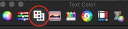To start, you click the colour globe for text colour, and select its toolbar icon that looks like a palette. In the following, I also have additional tools that I have added which are not available from Apple: