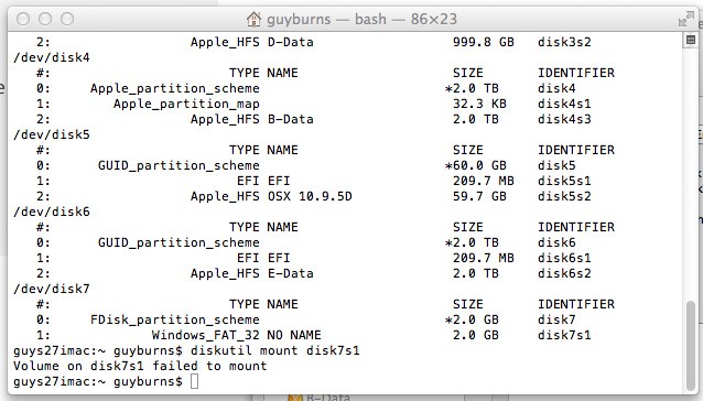 for example on my Mac there is a FAT32 USB attached, it is an internet dongle its Identifier is disk6s2, see below.