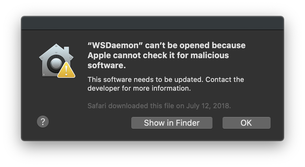 "WSDaemon" can't be opened because Apple cannot check it for malicious software