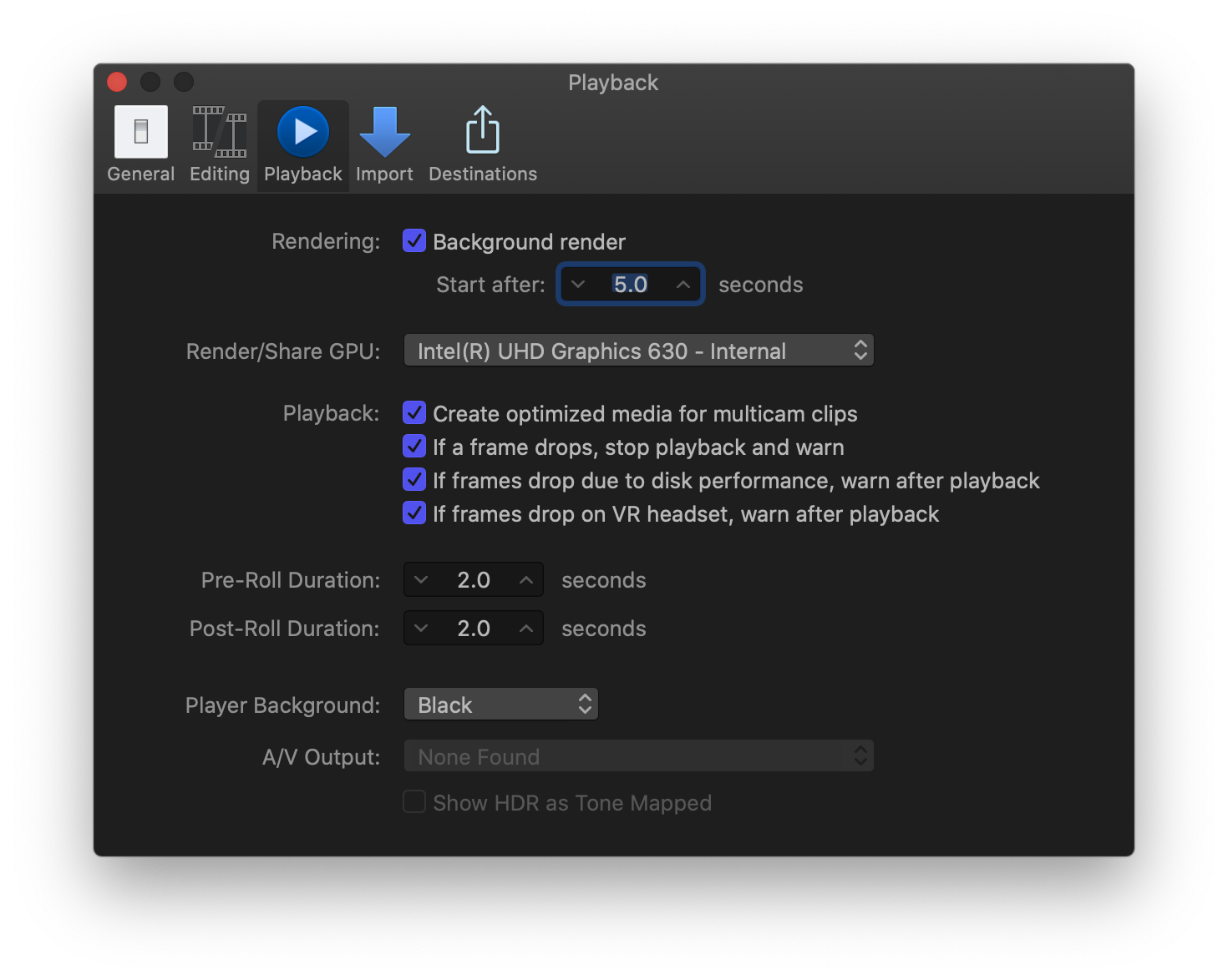 • Render/Share GPU: Use this pop-up menu to choose which graphics processing unit (GPU) to use in Final Cut Pro when rendering or sharing. This choice affects only rendering and sharing; real-time effects use the default GPU.