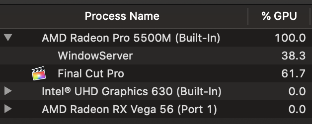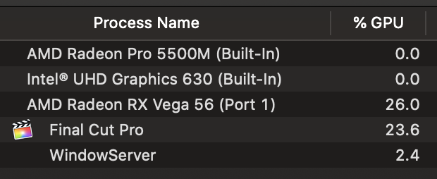 The above setup worked very well in FCPX 10.4.6 & Mojave - FCPX would use both internal and external GPU in tandem and never would i experience any lag though i had to open FCPX in low resolution mode for it to work properly. I would force the eGPU & Low Resolution mode from the Finder.