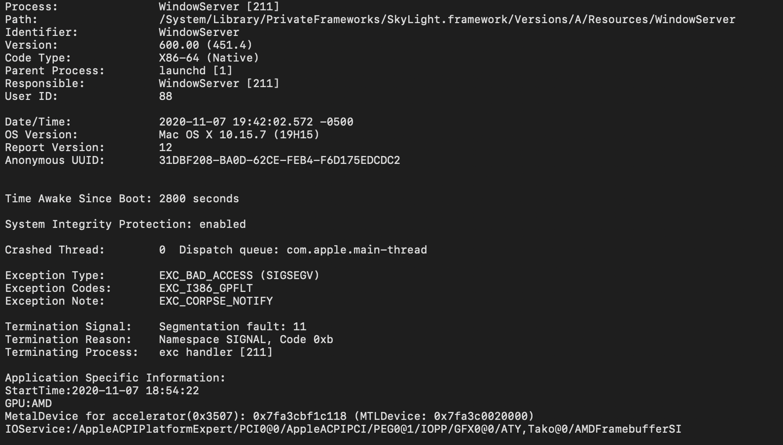 I fought with it off and on for a few months because I've never met a Mac I couldn't fix before but it never got any better. Finally I gave up, wiped the system clean and did a full clean install of Mojave 10.14.6. Unfortunately, this did not solve the problems fully. It did reduce my kernel panics to about 3-5 per day but the computer was constantly hanging such that it was completely unusable. I could get maybe 10-15 minutes out of it occasionally if I was really careful not to make it angry. Apple suggested the problem was non-standard RAM but the RAM was factory installed. Then it was external devices but I had long prior disconnected all of them. Then the logic board supposedly was the cause at which point I called BS. I also had Linux and Windows 10 installed on this machine and when I would boot into either one, the computer ran perfectly. I ran a full slate of hardware tests and all the hardware checked out okay. I was ready to give up on MacOS.