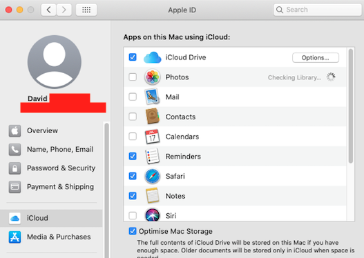 I can't turn on Photos in iCloud to bring the photos down from iCloud because if I try to put a tick in the Photos box in iCloud (System Preferences>Apple ID) it won't allow it and just says "Checking Library".