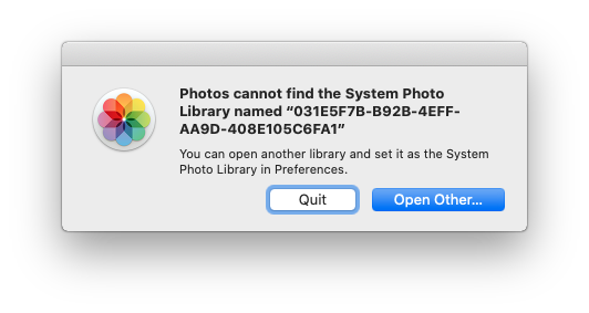 Upgraded to Catalina today and when I went to open Photos a dialogue box came up that says "Photos cannot find the system photo library named " .... ".