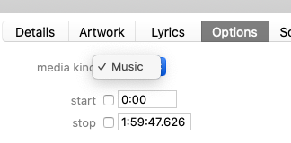 I can't do that in the new Music app – 'Music' is the only media kind that appears in the drop down in the track into dialog box.