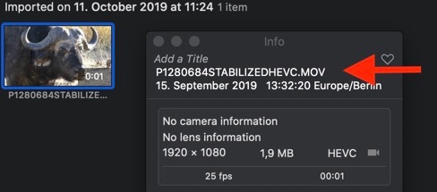 For example, I imported a video file called "P1280684StabilizedHEVC". In Photos in the Info the videos is displayed with the filename all in upper case letters and hard to read.