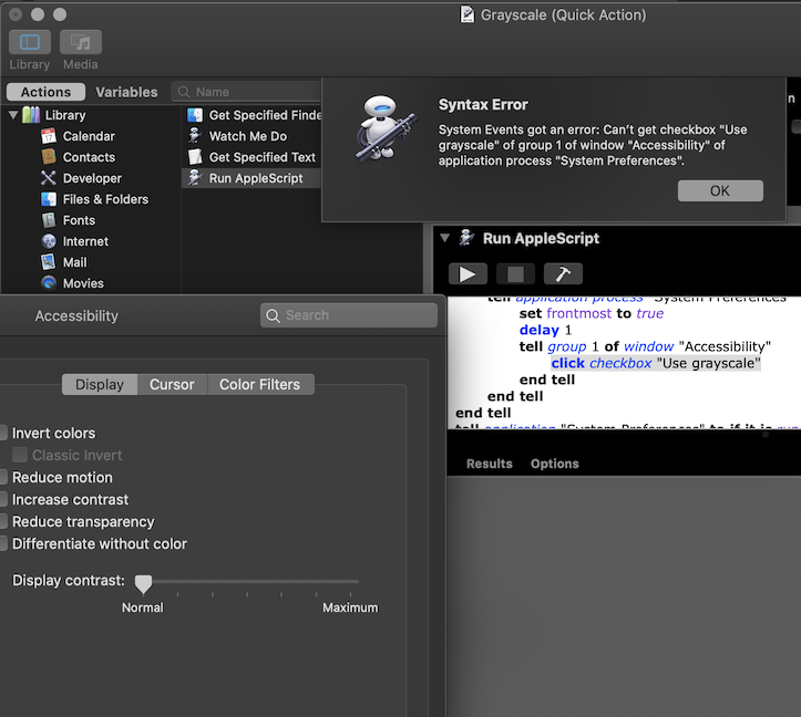 I found this script on StackOverflow (https://stackoverflow.com/questions/52583402/applescript-mojave-toggle-accessibility-grayscale-on-off) and it works for me: