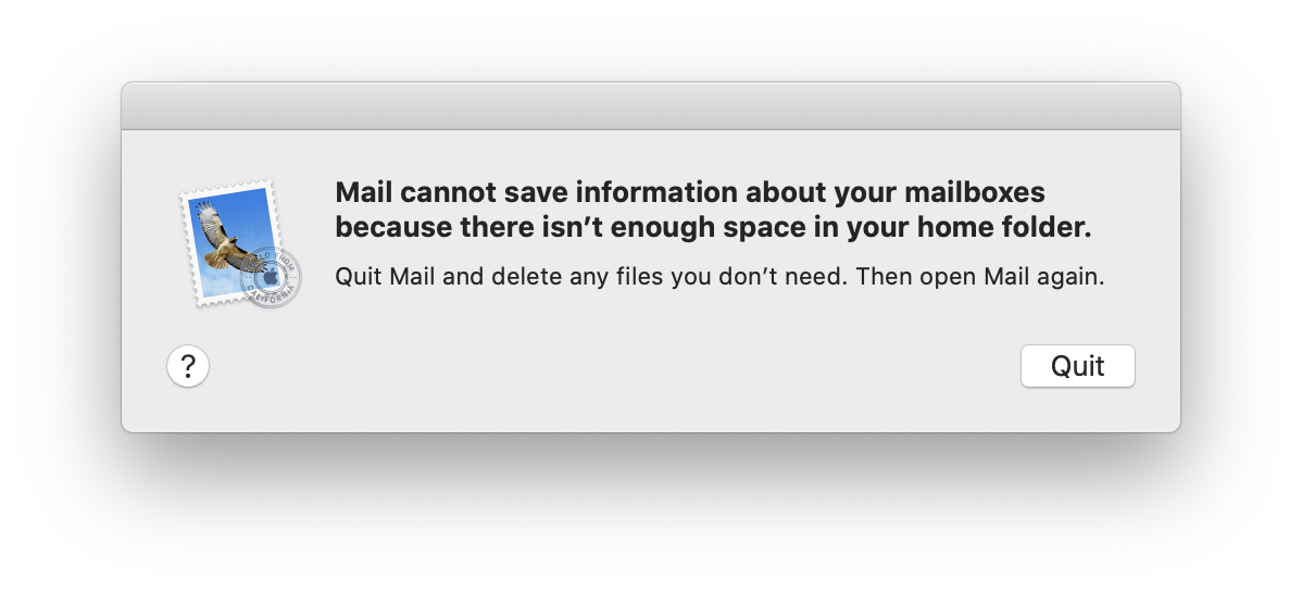 - Mail app shows a message saying there's not enough free space to download the mail and prompts to qui