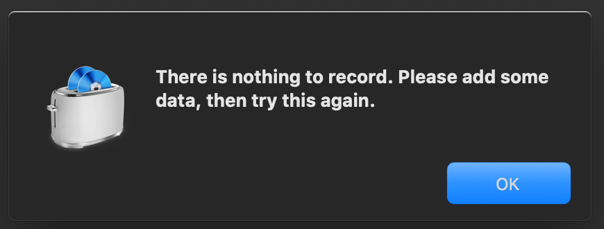 Toast is unable to properly detect the file size of a ProRes MOV file. Both 4444 and 422 ProRes mov video files (APCO, APCN, APCH) have been tested so far, all give the same issue. When a ProRes mov file is added to either a DVD or Blu-ray video disc project in Toast, the file size indicated at the bottom of the window will show 904 KB. If you proceed to burn the project, it will state "There is nothing to record. Please add some data, then try this again."